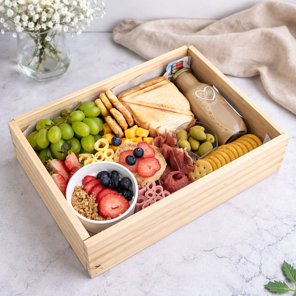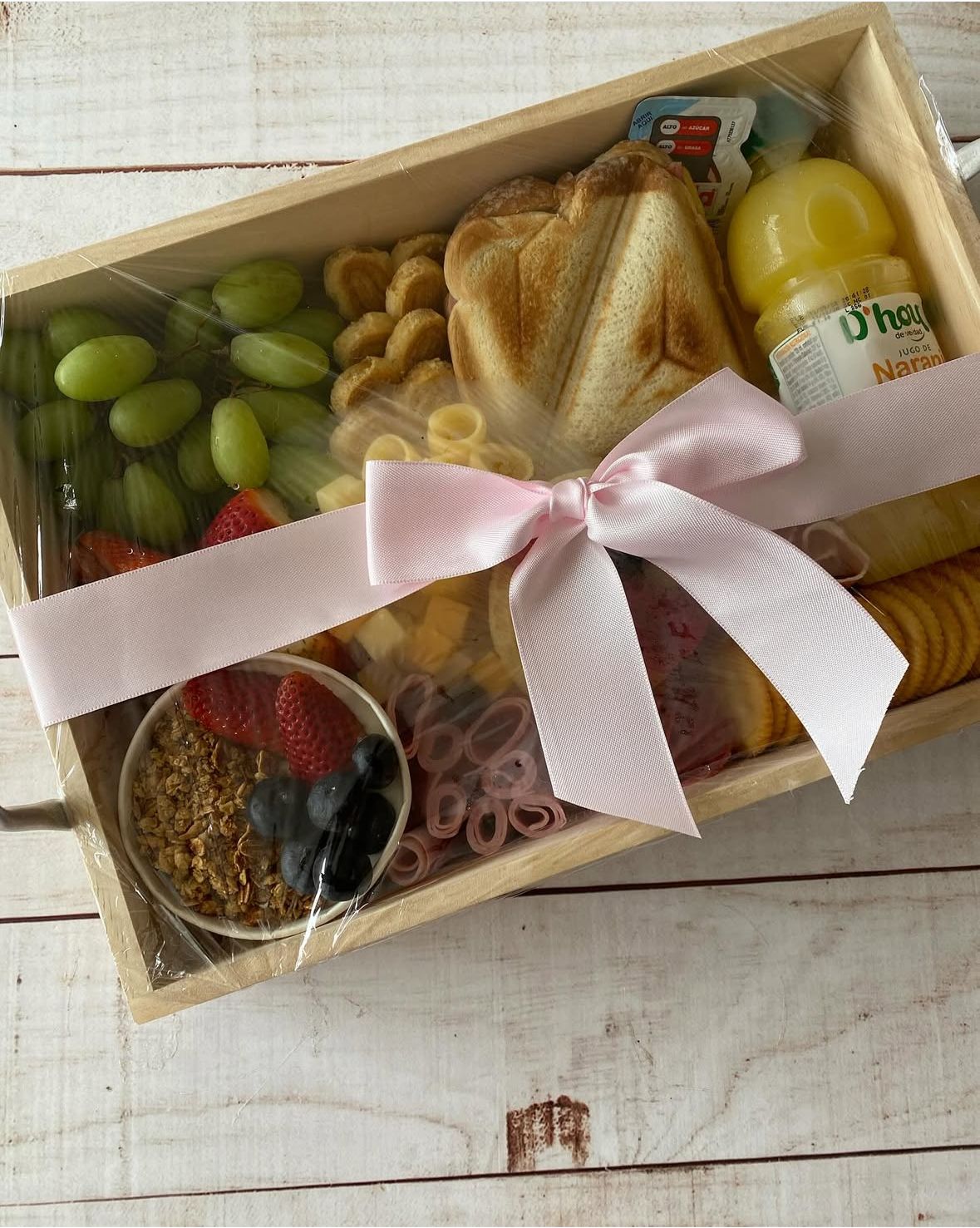 Incluye: Caja a disponibilidad, uvas, fresas, yogurt con frutas y granola, orejitas, queso cheddar, jamon, salami, pancakes, sanduche, aceitunas, jamon serrano, galletas de sal, jugo de naranja, nutella.