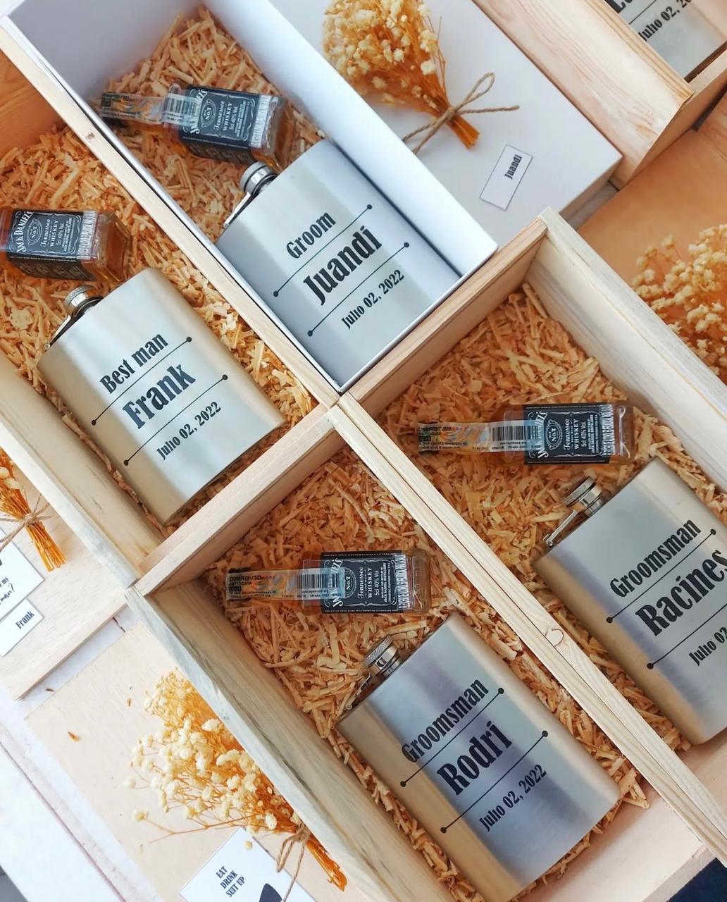 Incluye: Caja personalizada a disponibilidad, mini botella a disponibilidad, licorera de acero inoxidable personalizada.